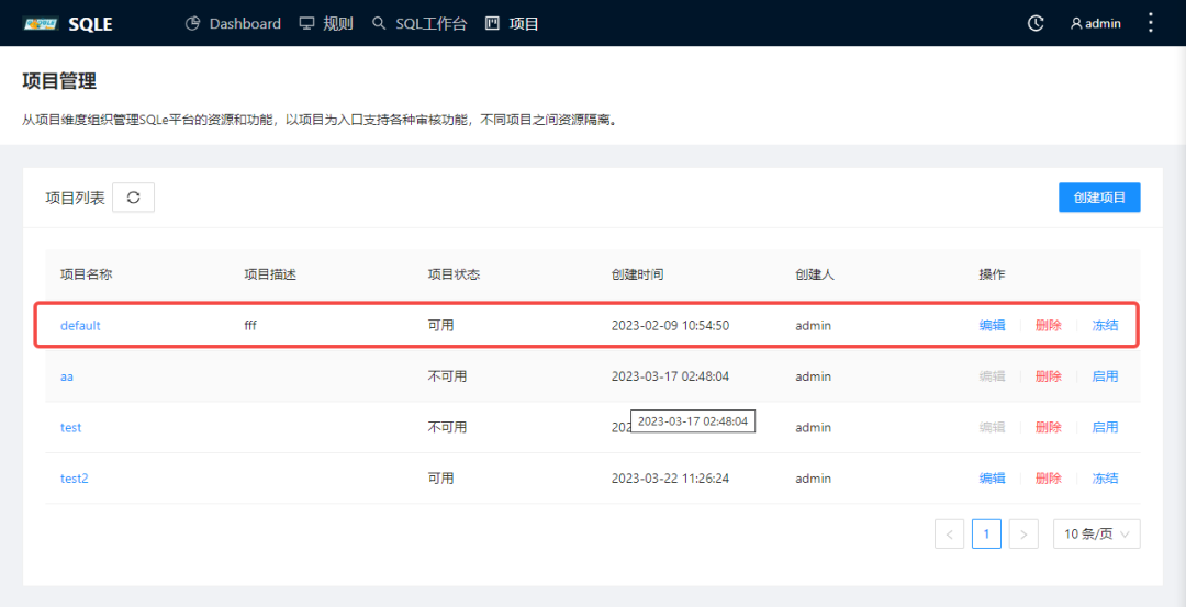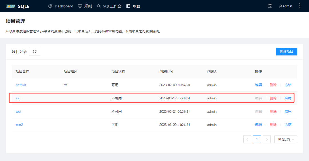 针对被冻结的项目,用户也可点击启用,项目列表中该项目状态变更为可用,且同步恢复项目内的操作行为。