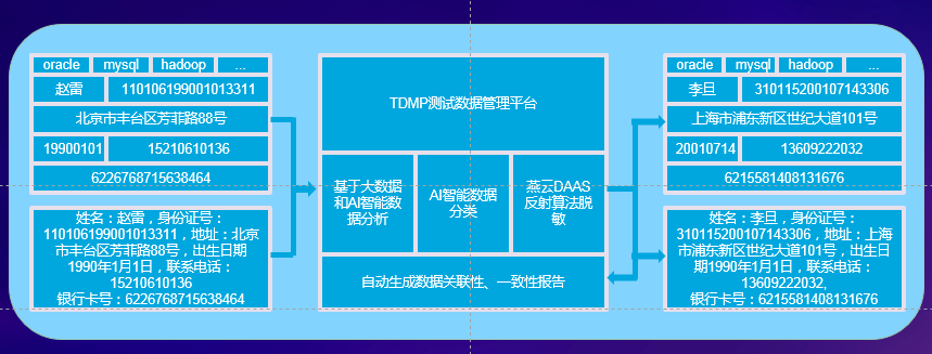 一致性:主要体现在两方面,第一种,跨平台数据间的一致性。每个人在不同的系统里扮演不同的角色,如信贷系统里叫张三,在核心交易系统也叫张三,脱敏之后在测试环境中他都变成郑五,而不会出现不同的结果;第二种,相同的数据进行多次脱敏,或者在不同的测试系统进行脱敏,数据始终保持一致性,只有这样才能保障业务系统数据变更的持续一致性以及广义业务的持续一致性。这一点,对高度敏感的账户类主体尤为重要。