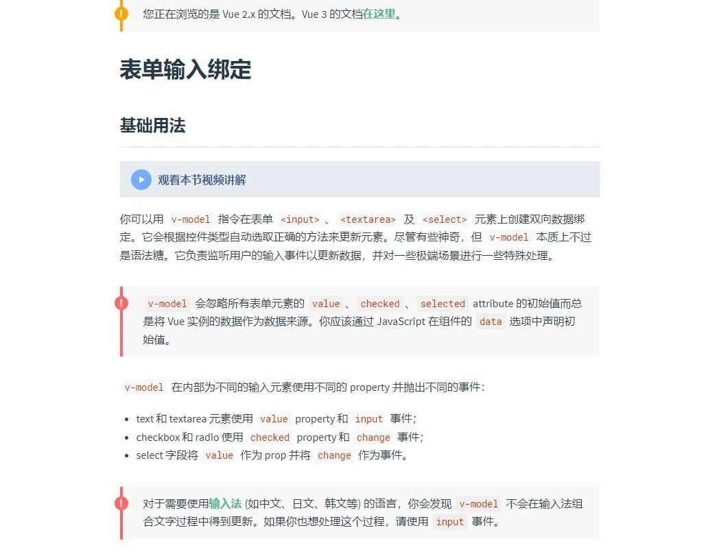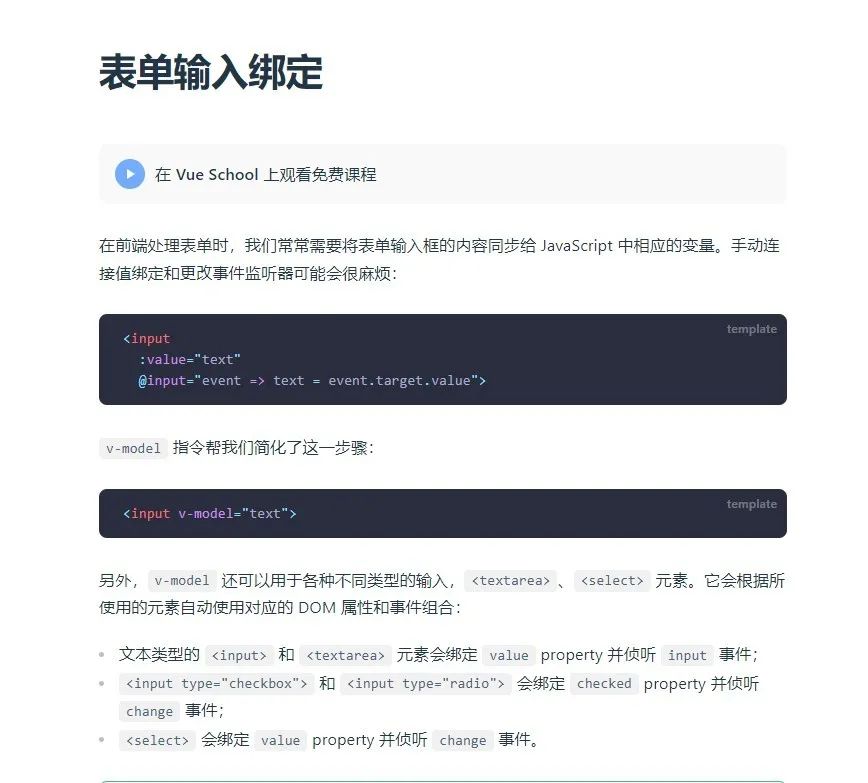 拼字阶段,我一下子就听懂了。上面我们演示了单个输入框用v-model实现双向绑定,在表单中我们常用的元素还有多行文本、复选框、单选按钮、选择器。下面是示例: