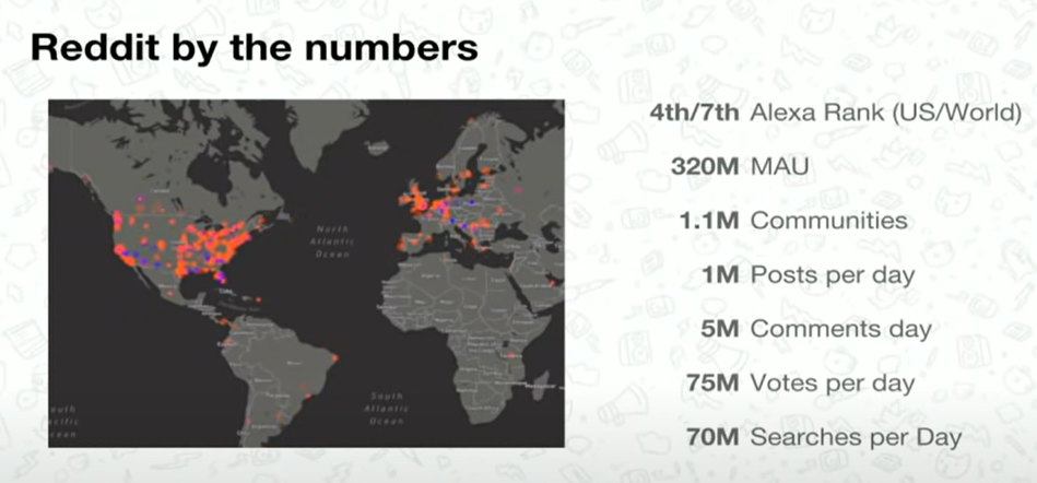 Reddit是一个内容的分享平台,用户通过点赞或踩来进行投票,获赞越多的帖子就会排得越上面。有人开玩笑说它就是美国版的天涯+贴吧。在2017年的时候,它的用户数据如下图所示,大概每天有一百万的post,五百万的评论,7500万的Votes,所以数据量还是很大的。