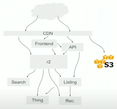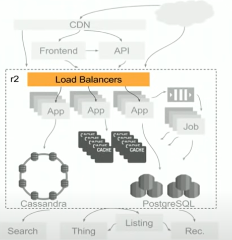 R2: 在早期开发Reddit的时候,它是一个Monolith的架构,现在有一些功能被从中提出来放到整个架构的各个部分(API, Search,Thing, Listing, Rec等),而剩下来的都还在原有的这个Monolith模块中,称之为r2.
