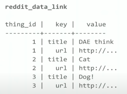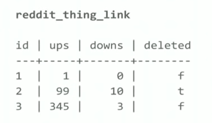 Thing我们可以认为是储存在PostgreSQL和MemCache中的数据模型(原本也在r2中,只是后来分离出来),基本来说由两种表构成,首先是thing table,它里面的column都是用来为Reddit的sorting以及filter来服务的,如下图所示: