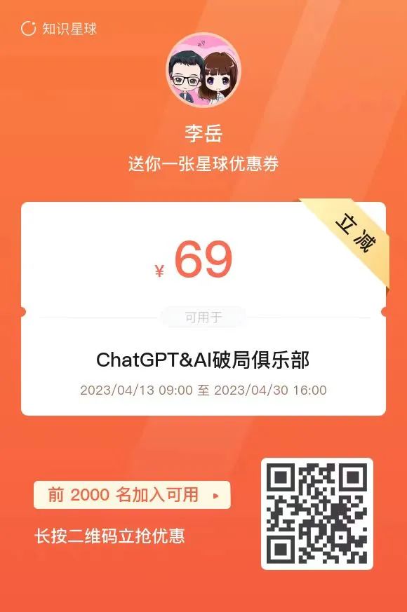 通过我这边的优惠券加入,价格是199元,绝对是最低的价格。加入后可以看到最新的关于ChatGPT的玩法、能够亲自上手体验,我们搭建了相关的服务,会提供账号,同时会有最新的和大模型相关的价值数千元的课程直接提供给大家。