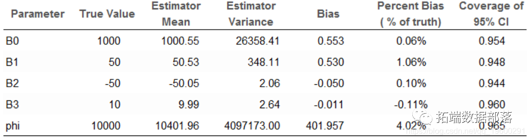 下表列出了参数的实际值和使用Metropolis采样器得到的估计值的平均值。