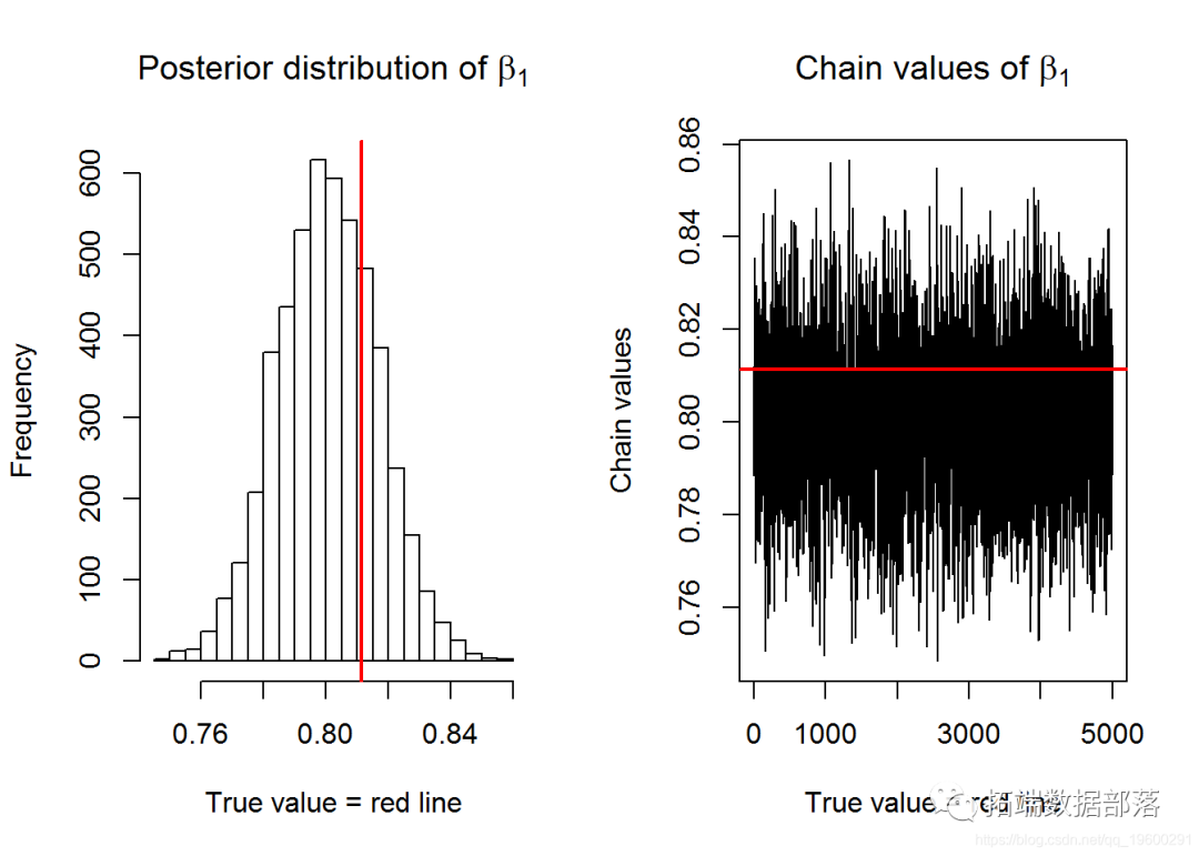 在这一节中,我们介绍了由Metropolis采样器产生的链以及它对参数β0和β1的分布。参数的真实值由红线表示。