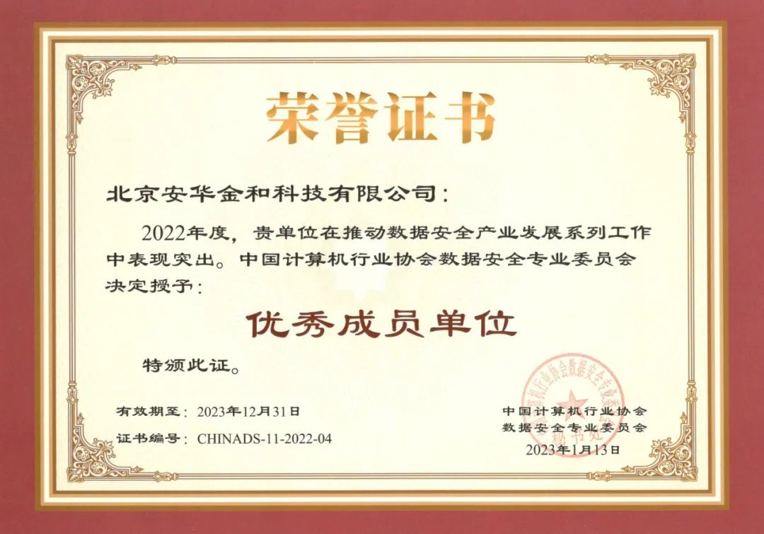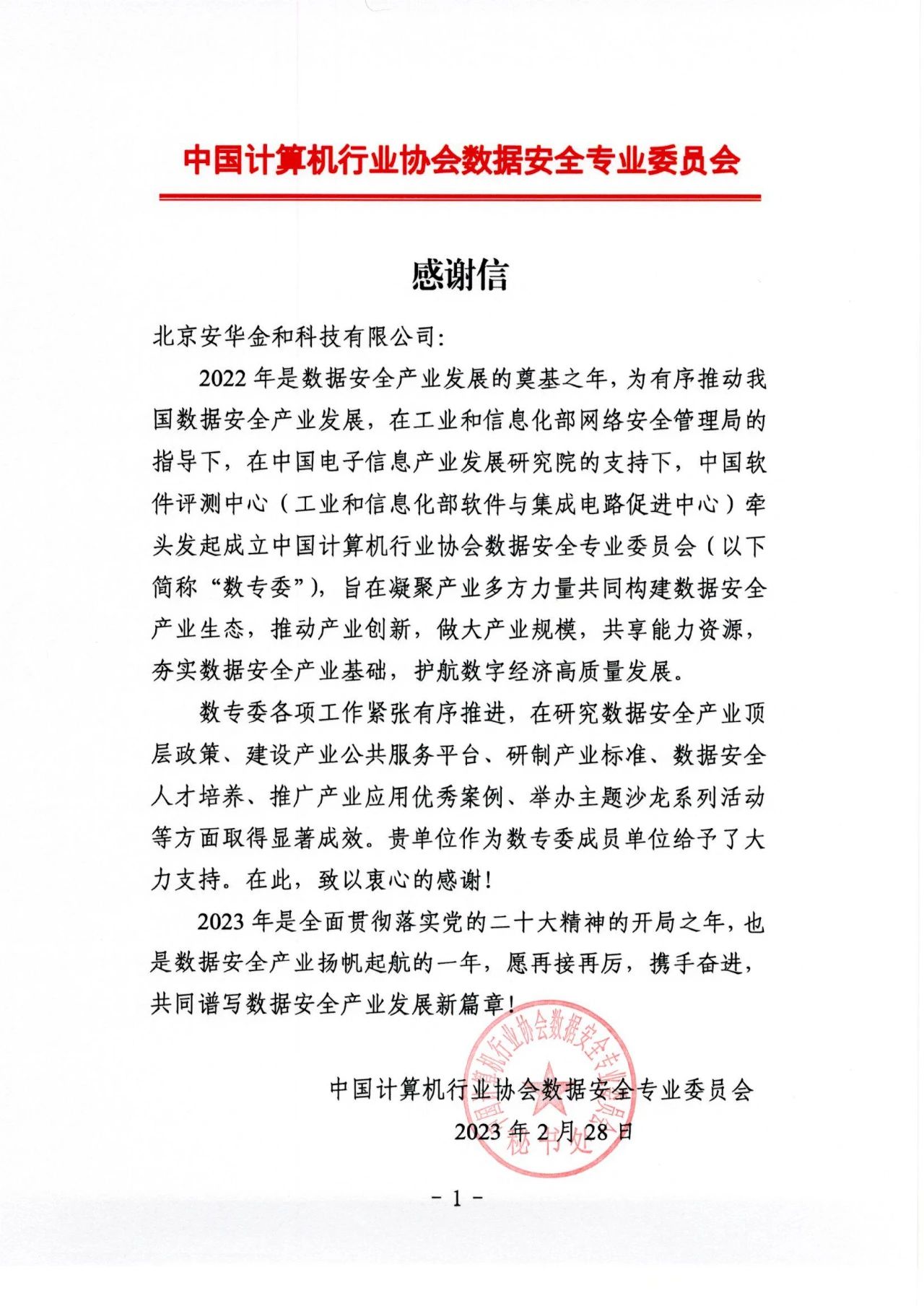 近日,中国计算机行业协会数据安全专业委员会(以下简称“数专委”)工作组年度工作会议在京顺利召开。作为数专委成员单位,安华金和2022年积极参与数专委各项工作,被授予“优秀成员单位”称号,并收获数专委感谢信。