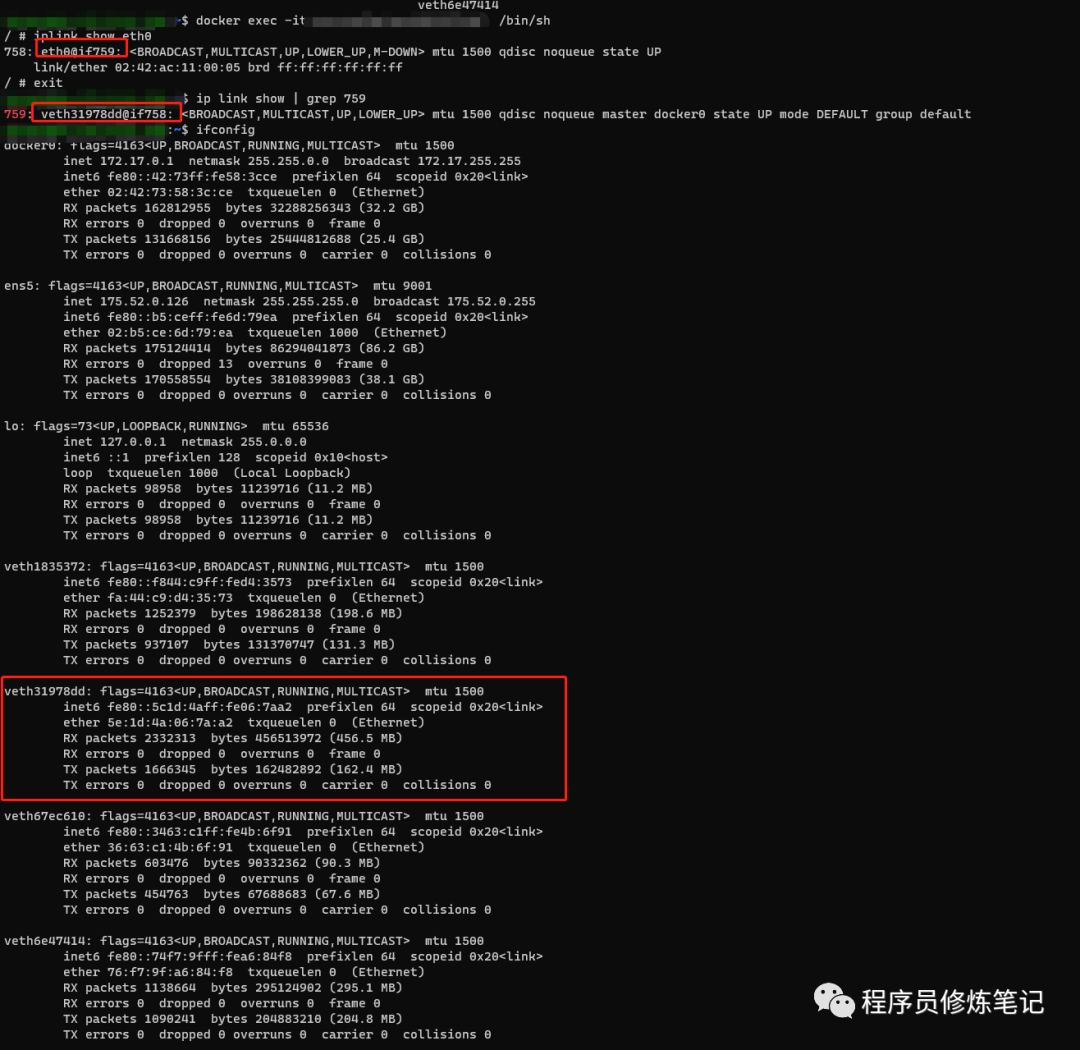 Veth Pair设备的另一端网卡则存在于我们的宿主机上,我们可以通过上图中的一些命令精准的找到容器内网卡对应的宿主机的网卡,可以看到Veth Pair设备名称是veth31978dd。
