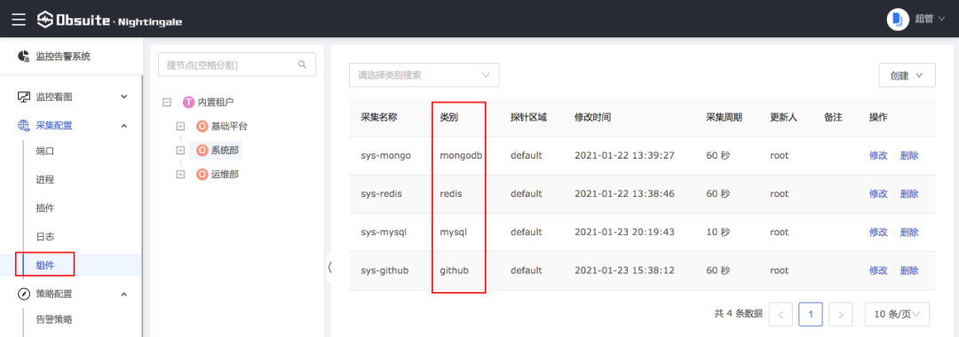 上图我测试了4种组件采集,由于这个prober的扩展非常容易,开源社区有人贡献了Nginx、ElasticSearch、Prometheus的采集(刚开源Prober一周,就有朋友新贡献了3个组件采集器,可见集成telegraf,与夜莺做整合是非常容易的),所以如果大家拉取 https://github.com/didi/nightingale master上面的代码编译monapi和prober,应该不但可以看到mysql redis mongodb github这4类,还可以看到nginx、elasticsearch、prometheus的选项。
