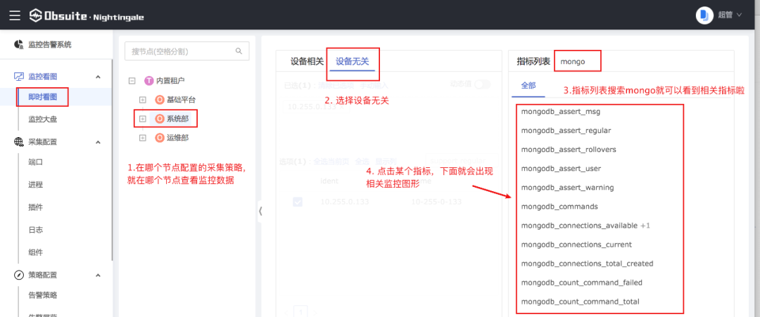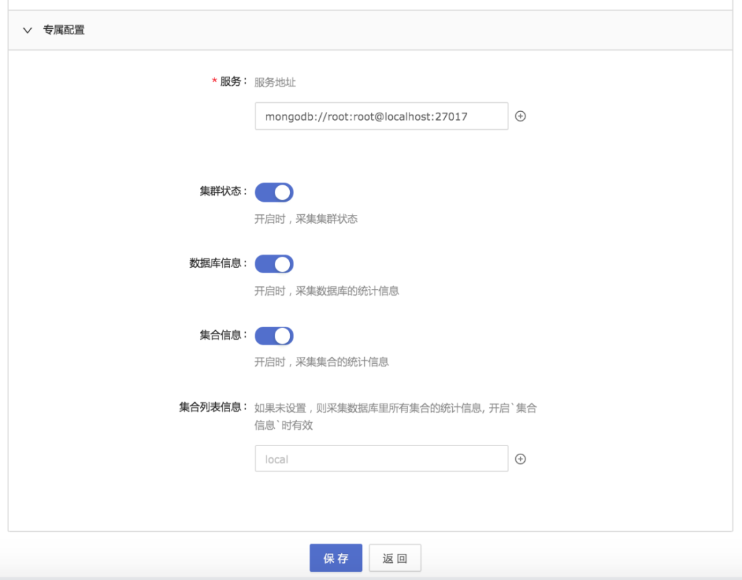下面我们看一个mongodb的采集配置页面,主要就是填写mongodb的连接地址,夜莺的Prober模块就会周期性的去连接到mongodb实例,运行采集命令收集数据,简单到爆!