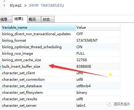 bulk_insert_buffer_size默认是8M,我们要把它调成100M或百兆以上,也不要太大。下面看调整个好的,如下图: