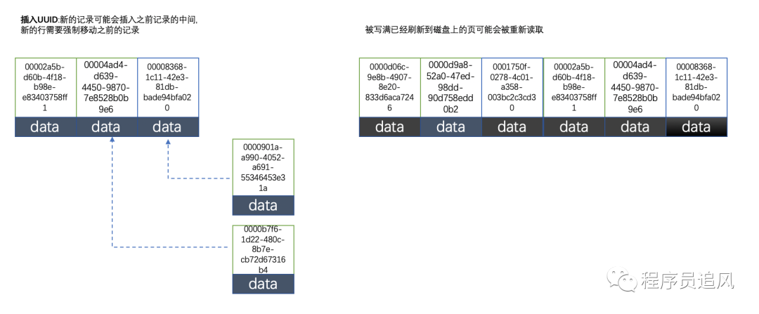 因为uuid相对顺序的自增id来说是毫无规律可言的,新行的值不一定要比之前的主键的值要大,所以innodb无法做到总是把新行插入到索引的最后,而是需要为新行寻找新的合适的位置从而来分配新的空间。
