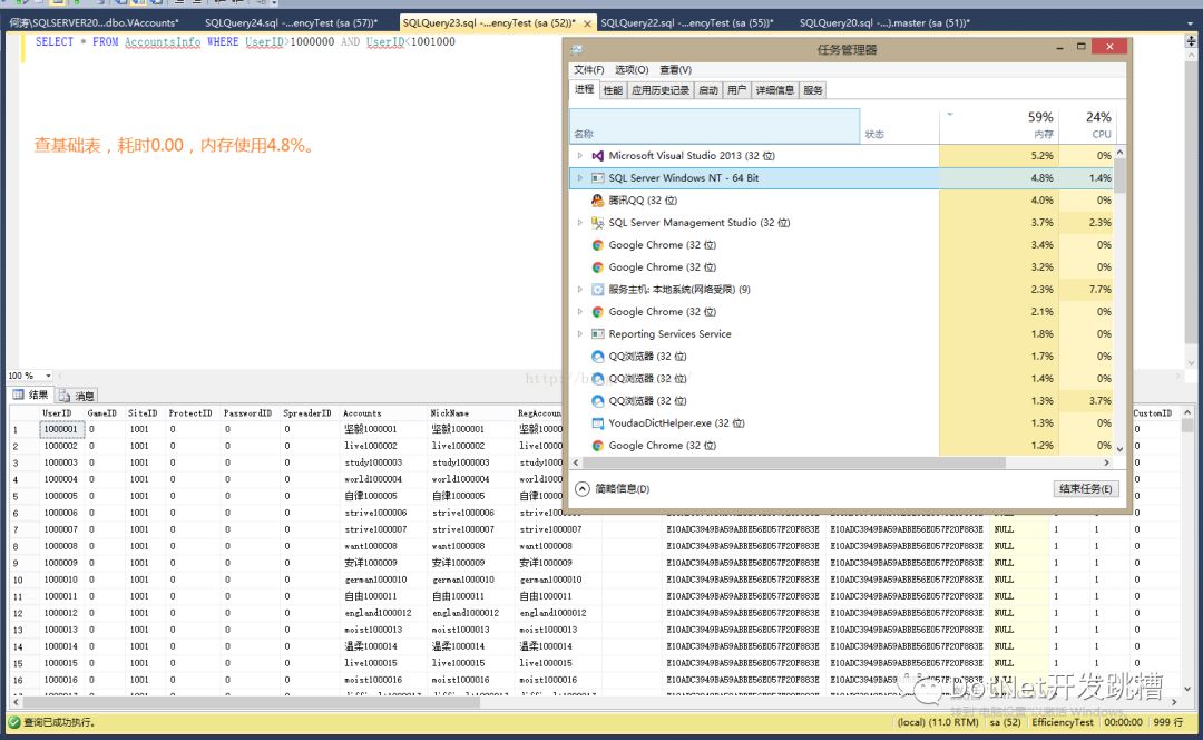 1. 我们查询视图的时候会利用到基础表的索引吗?这里我利用UserID来做WHERE查询1000条数据。下面两个截图分表是查询的结果,我们可以清楚到看到查基础表AccountsInfo与查视图VAccounts的效率是没有差别的,所以我们可以确定查视图同样会利用到基础表的索引。