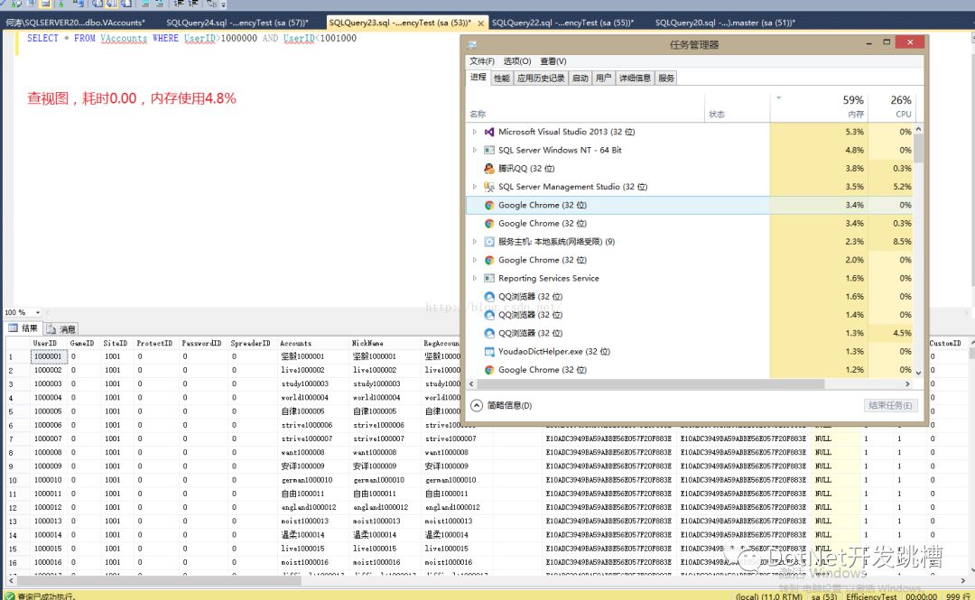 开发一个项目,数据库用的是sqlserver。帐号表数据有一两百万,不算大,也不算小。在考虑是否要使用视图,担心效率,百度了下资料,众说纷纭,好吧,实践是最好的证明,那么我们就来测试吧。