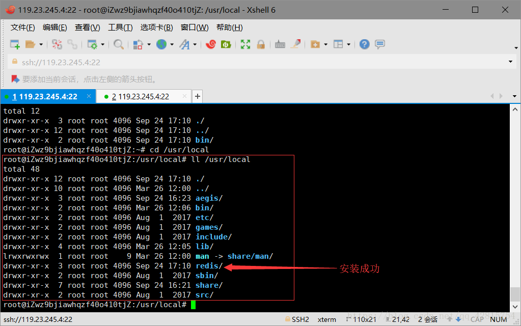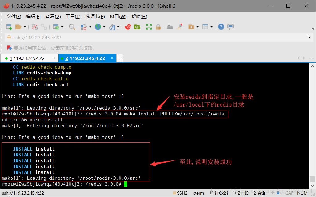 2.7安装编译后的redis代码到指定目录,一般存放于/usr/local下的redis目录,指令如下