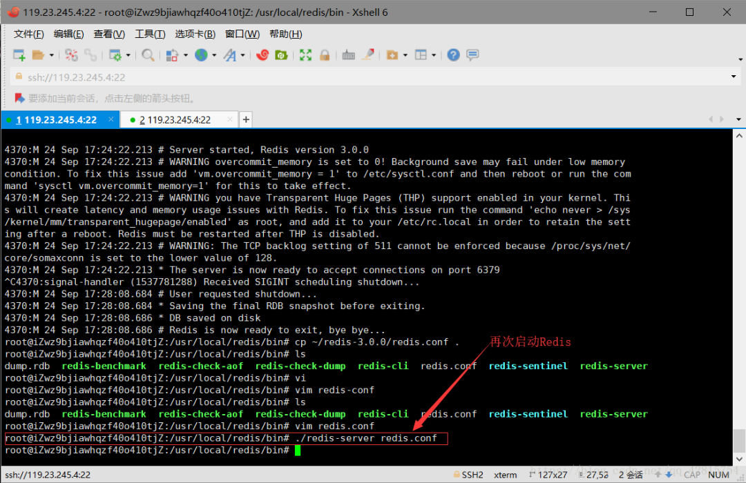 2.10 前端启动的话,如果客户端关闭,redis服务也会停掉,所以需要改成后台启动redis.