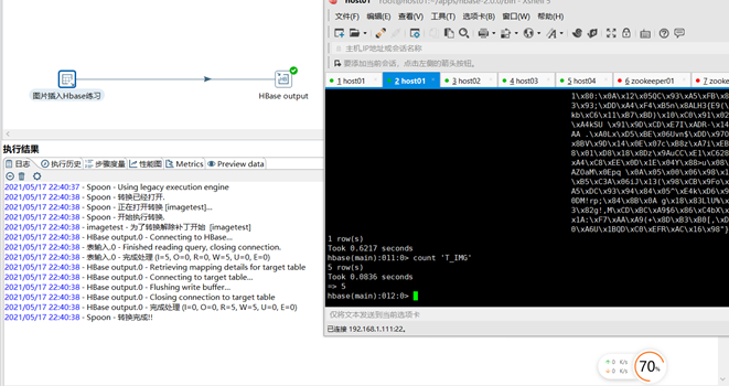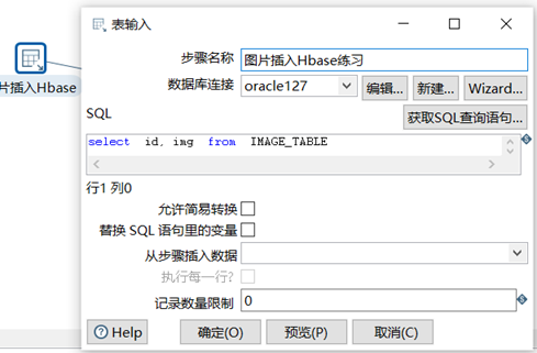 使用kettle打通Oracle,Hbase。用kettle抽取Oracle中图片数据,再接入Hbase中。(以前使用kettle把数据接入到Hadoop的文本中,再调用load命令完成入hive库改进 kettle直接入hive库,效率提升20多倍)。本次不同了,不能用数据文件作为过渡。对数据抽取工具的依赖加大了,所以数据抽取工具需要考究。