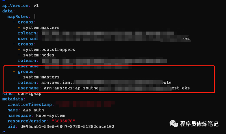 需要在aws-auth ConfigMap中增加红框中的内容,其中rolearn是Jenkins Slave节点上的role。