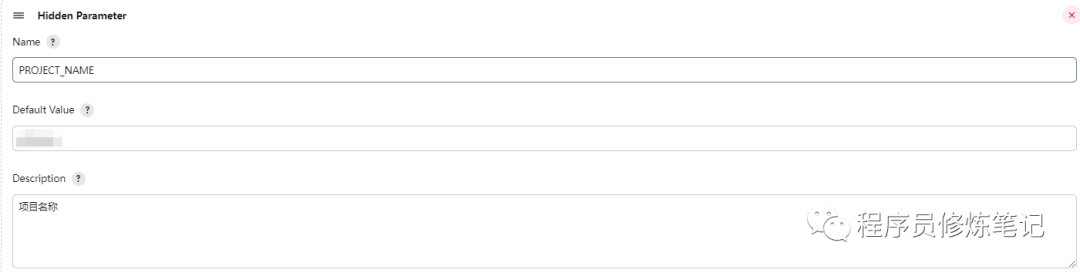 5. 增加一个隐藏参数,用来设置项目名称,该参数不需要由用户选择,但是会在我们的构建脚本中进行使用,如下图:
