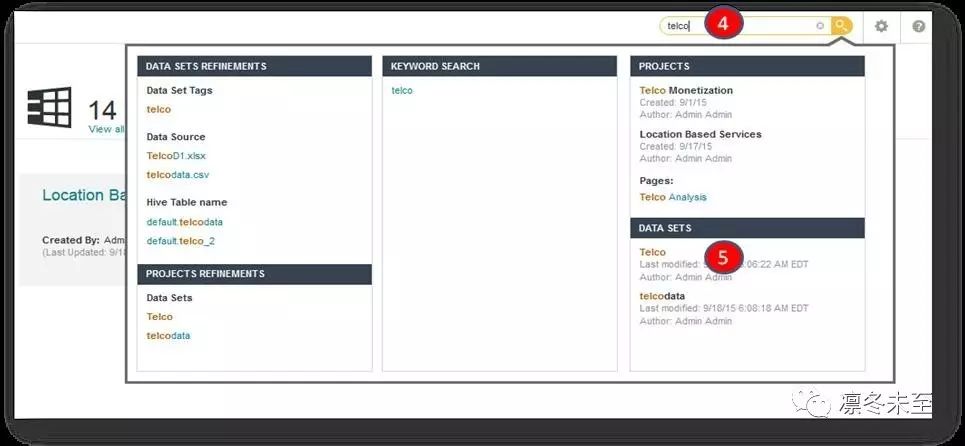 2、登录成功后,因为我们已经提前导入了Telco测试数据,在搜索框输入Telco搜索数据集,找到数据集后,点击打开,示例如下: