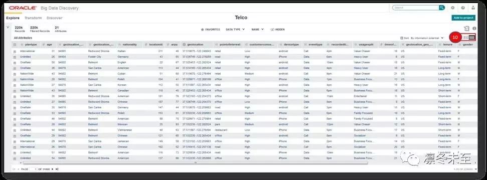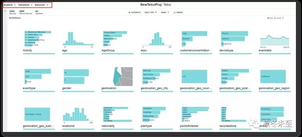 6、数据集添加成功,出现项目的主页面,这个页面主要包括三个选项板,Explore, Transform 和Discover。