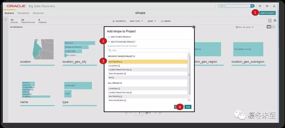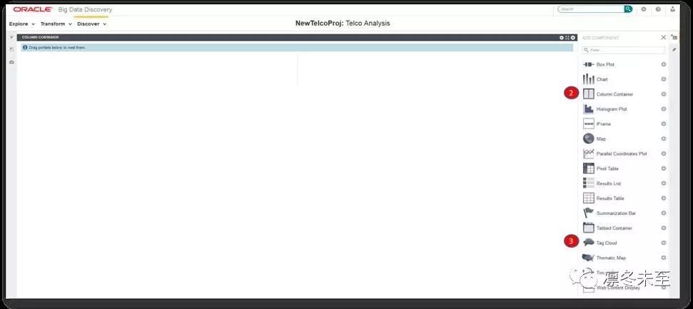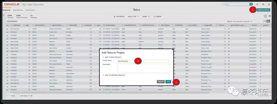 5、按照图示,执行1,2,3步骤,把Telcom数据集增加到一个分析项目