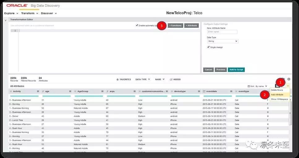 7、我们点击transform面板来看一下BDD的数据转换能力,我们现在为数据集增加一个新的属性,在图示一次点击,在出现的编辑框里输入数据转换逻辑。