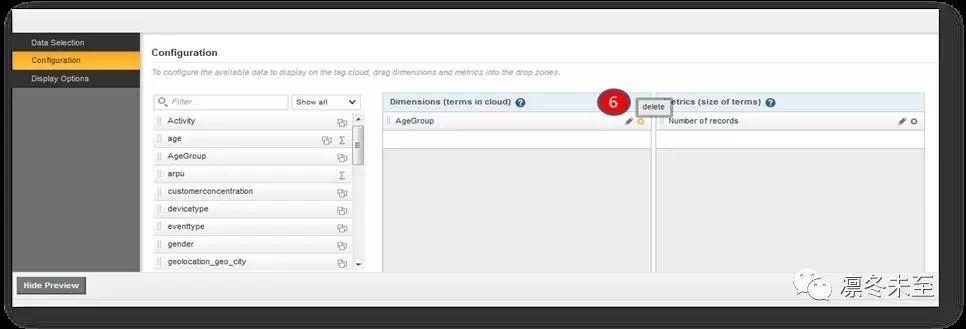 我们看到了默认配置,我们来分析一下这个配置,聪明的朋友一定发现了端倪,我们的Tag Cloud是以用户的年龄来分类统计的,统计的是每个年龄段使用通信网络的次数。并且哪个年龄段的统计人数多,他的演示字体就越大,反之越小。我们先清除默认配置,增加如下的内容,大家想想我们会得到什么信息呢?????嘻嘻!!
