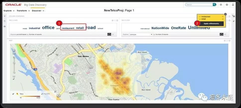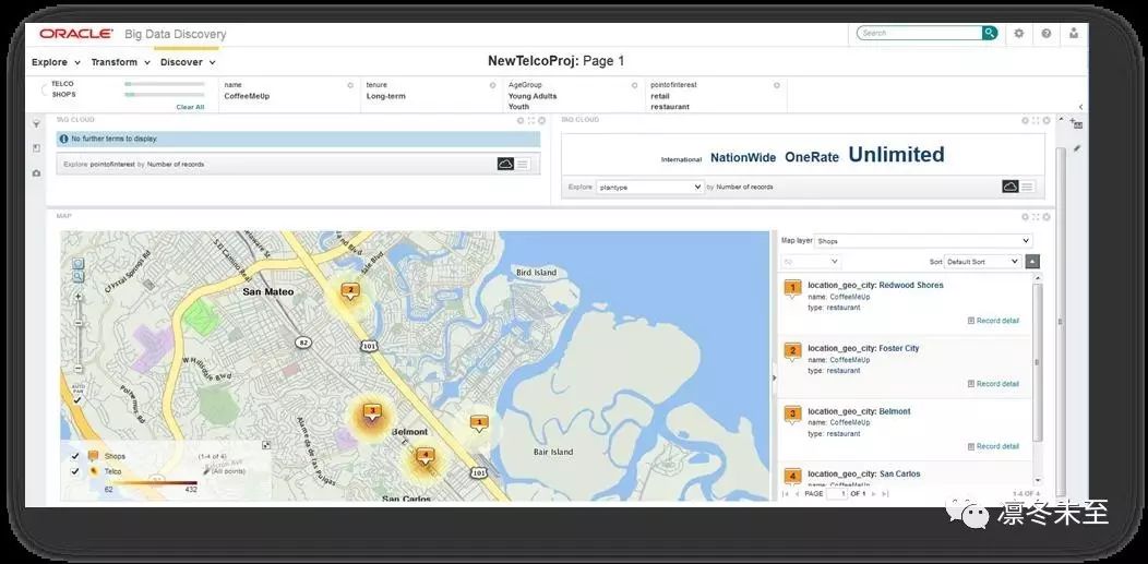 14、 如上图所示,这就是我们设计好的Discovery页面,包括2个Tag Cloud和一个Map组件,Map主机中黄色区域表示的就是GoEagle客户经常通过移动网络上网的区域,颜色越深表示这个地方上网的人数也就越多。我们再来分析一下,如图所示我们第一个Tag Cloud组件中仅仅选择Restaurant 和retail内容,我们Map组件中演示的内容就连带着被过滤的,这意味着地图上显示的区域仅仅表示GoEagle的客户经常出现的酒店和商超的信息,这些商业客户就是GoEagle开发精准促销、活动推送新增值服务的潜在商业客户呀!!!到这里大家看出点意思来了吧。现在还有些不足,这些商家的地址等信息没有显示出来,如果这些能显示出来,我们的这个挖掘就更完美了。接下来我将给大家演示如果把更多的数据源和已有的数据进行关联,迫不及待了吧!!!!!
