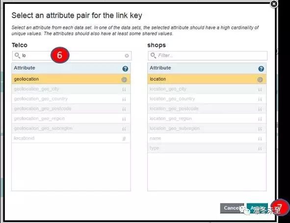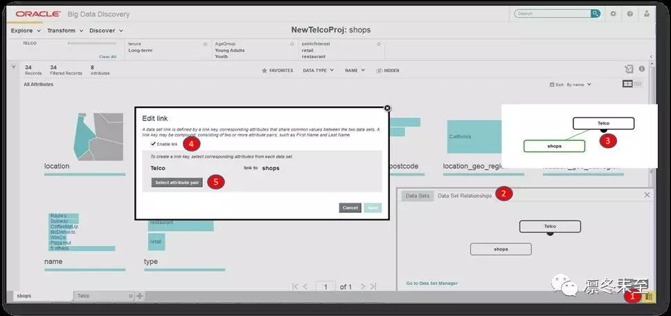 点击红色小标1的data set details按钮,出现Data Set Relationships面板,红色小标2所示的区域,然后按下鼠标在两个数据集之间拉一直线,出现另一个页面,在出现的页面中点击Select attribute pair按钮,进行两个数据集的关联。