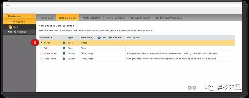 17、 下面我们来重新编辑Map组件的属性,把商家的信息附加到Map组件的显示上。打开Map选项,点击+Layer按钮增加一个新的图层