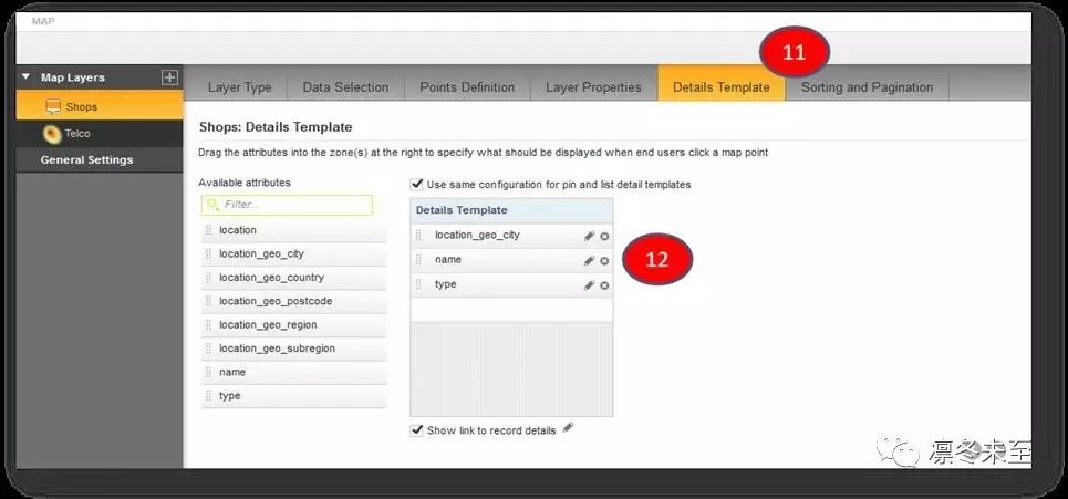 我们选择Numberof Records选项,然后保存。然后点击Details Template选项,定义地图上显示图标的提示信息字段。