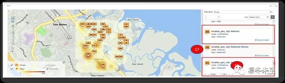 在Map上我们可以清楚的看到29和31这个点的颜色较深,也就是说这些地方上网的人最多了,我们看看他们显示出来的信息,哦有意思了,都指向了同一个品牌的商家CoffeeMeUp,看看在CoffeeMeUp上网的用户是最多的了。这也就意味着GoEagle为这个品牌推荐他们增值服务他们是会非常感兴趣的,大家看看GoEagle的第一个客户找到了,他们还想看看,到底他们可以联系哪些城市的CoffeeMeUp呢。这个也很Easy,我们只要点击CoffeeMeUp,地图上所有它的信息显示出来了。