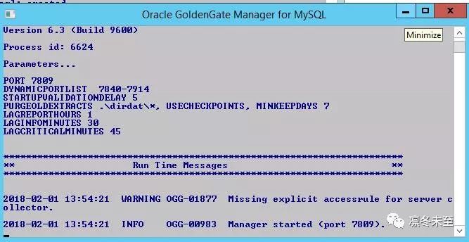 2)、在GGSCI的命令行窗口里,执行edit param mgr命令,创建mgr.prmPORT 7809DYNAMICPORTLIST 7840-7914STARTUPVALIDATIONDELAY 5PURGEOLDEXTRACTS .\dirdat\*, USECHECKPOINTS, MINKEEPDAYS 7LAGREPORTHOURS 1LAGINFOMINUTES 30LAGCRITICALMINUTES 45