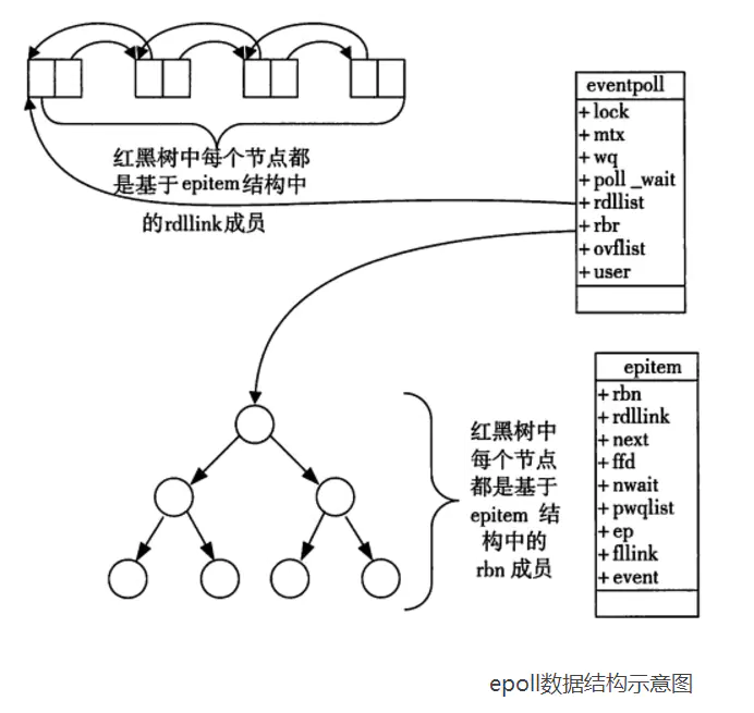 当调用 epoll_create 函数时,内核会创建一个 eventpoll 结构体用于存储使用 epoll_ctl 函数向 epoll 对象中添加进来的事件。这些事件都存储在红黑树中,通过红黑树高效地识别重复添加地事件。所有添加到 epoll 中的事件都会与设备(网卡)驱动程序建立回调关系,当相应的事件发生时会调用这个回调方法,它会将发生的事件添加到 rdlist 链表中。调用 epoll_wait 函数检查是否有事件发生时,只需要检查 eventpoll 对象中的 rdlist 链表中是否存在 epitem 元素(每一个事件都对应一个 epitem 结构体)。
