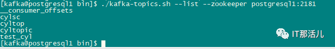 ./kafka-topics.sh --list --zookeeper postgresql1:2181