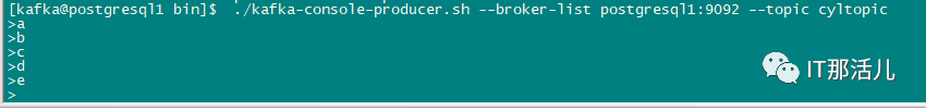 ./kafka-console-producer.sh --broker-list postgresql1:9092 --topic cyltopic