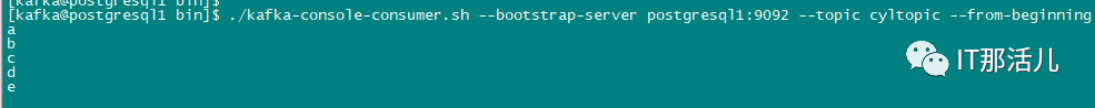 ./kafka-console-consumer.sh --bootstrap-server postgresql1:9092 --topic cyltopic --from-beginning