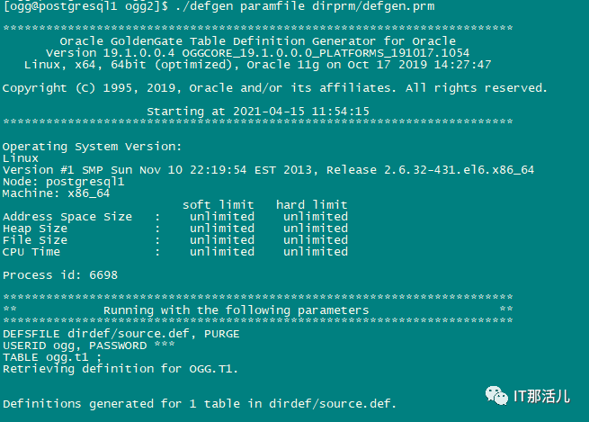 ggsci>edit param defgen内容DEFSFILE dirdef/source.def, PURGEUSERID ogg, PASSWORD xxxxxxxxxxxxxxxxxxTABLE ogg.t1 ;[ogg@postgresql1 ogg2]$ ./defgen paramfile dirprm/defgen.prm --shell命令