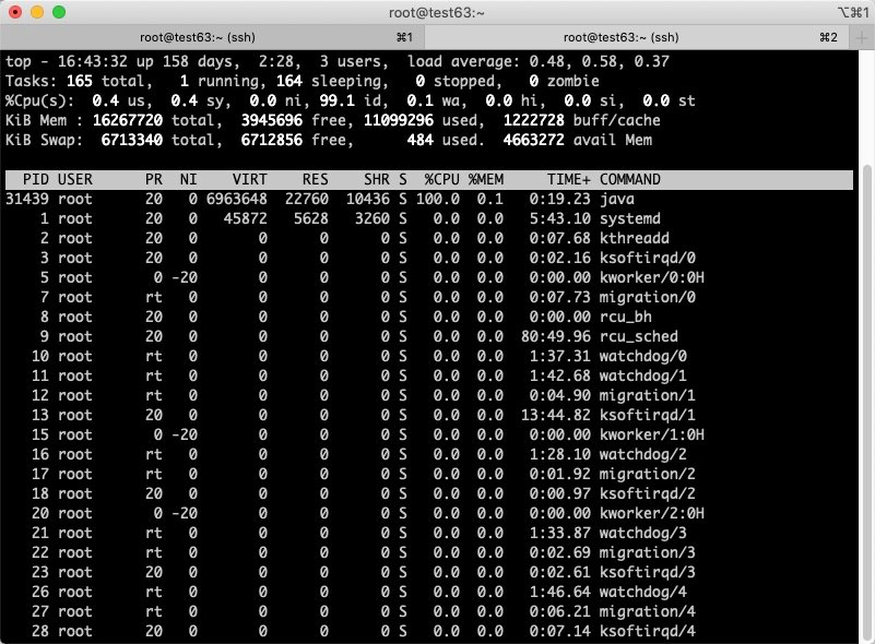 PID:进程PID USER:进程所有者的用户名 PR:进程调度优先级 NI:从用户空间视角的进程优先级(niced值),值越低优先级越高 VIRT:进程使用的虚拟内存(kb),VIRT=SWAP+RES RES:进程使用的(未被换出的)物理内存(kb),RES=CODE+DATA SHR:共享内存大小(kb) S:进程状态 D:不可中断的睡眠状态 R:运行 S:睡眠 T:跟踪/停止 Z:僵尸进程 %CPU:进程占用CPU时间比例 %MEM:进程占用的物理内存比例 TIME+:进程占用的CPU时间总量(ms) COMMAND:运行进程使用的命令