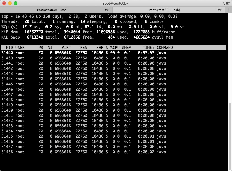 命令查看该进程下各线程CPU资源的使用情况。