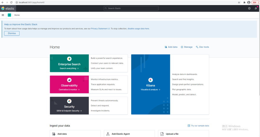Kibana启动成功后,浏览器访问http://localhost:5601/显示如下界面则表示启动成功: