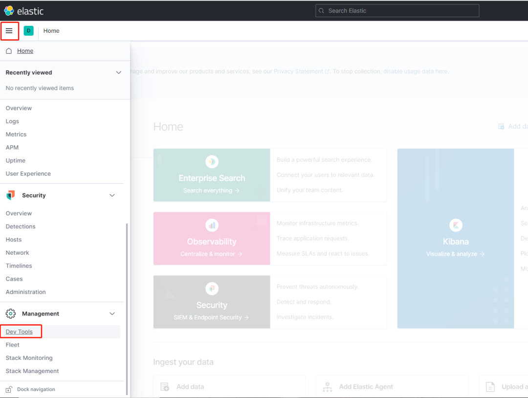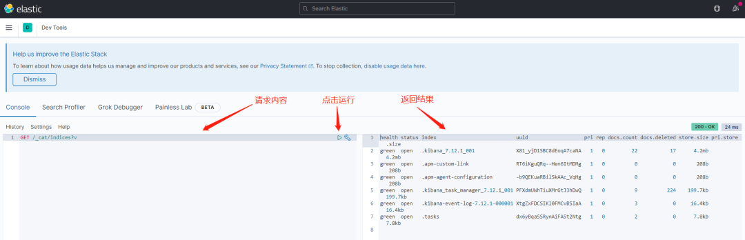 成功启动Kibana后,可以使用Kibana的Dev Tools进行Elasticsearch的REST API调用: