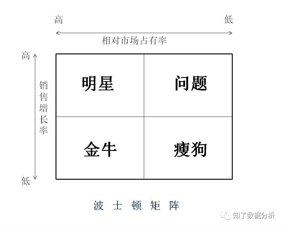 波士顿矩阵其实就是通过决定产品结构的两个基本因素:销售增长率与市场占有率,将产品分成四种类型: