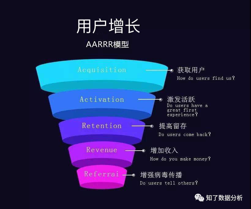 除了常规的漏斗图,其实大名鼎鼎的AARRR海盗模型也是一种典型的漏斗分析模型,从开始的用户获取到最终的用户转化和推荐,通过提升每一个环节的转化率,从而最终达到用户爆发式增长的目的