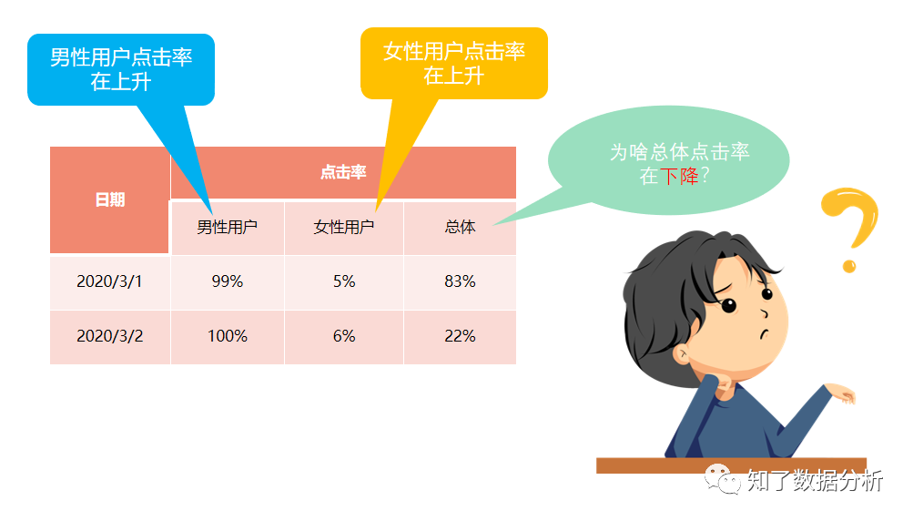 某运营人员通过公众号推送自家公司的活动宣传页面,某天通过统计数据发现:相比昨天,男性用户点击率升高,女性用户点击率也在升高,但是当统计总体点击率时发现却在下降,于是他感到非常困惑,百思不得其解……