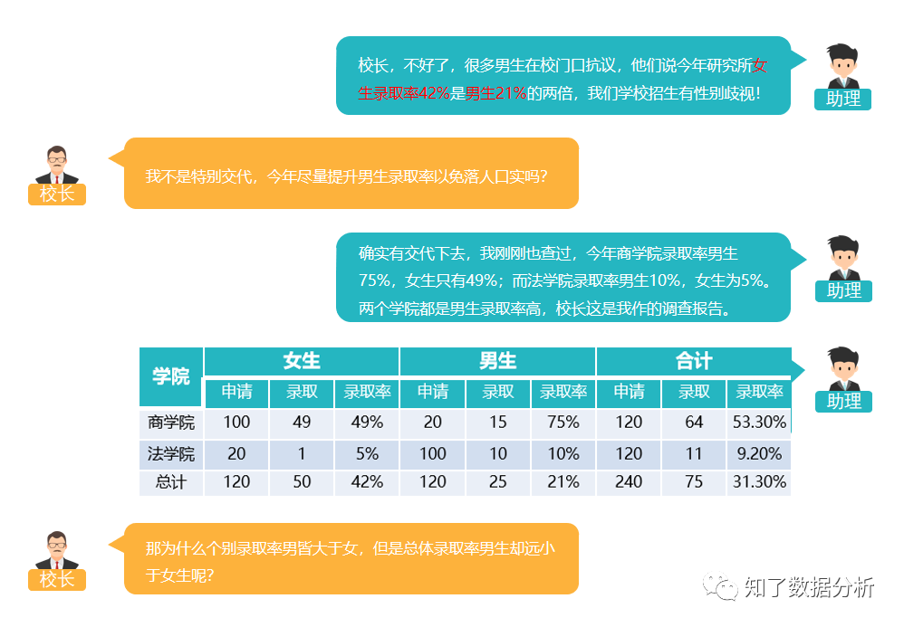 性别并非是录取率高低的唯一因素,甚至可能是毫无影响的,至于在法、商学院中出现的比率差可能是属于随机事件,又或者是其他因素作用,譬如学生入学成绩,使人误认为这是由性别差异而造成的。