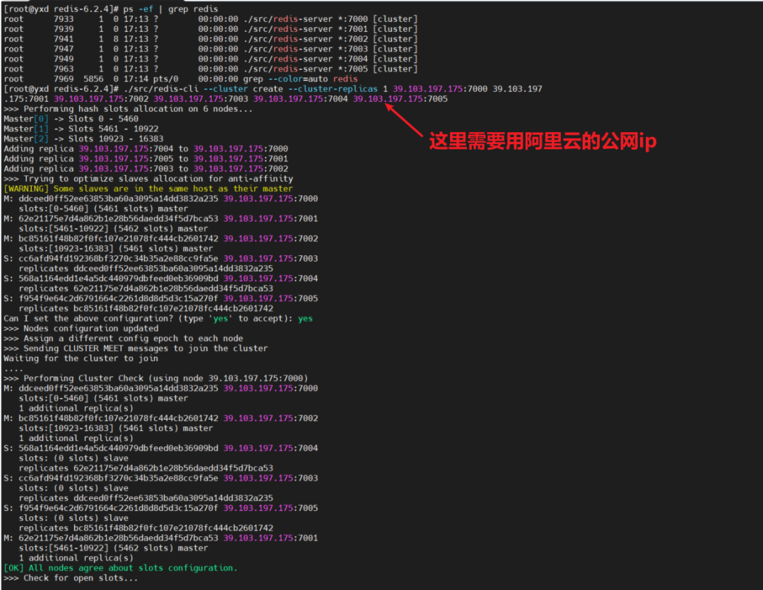 参考:Redis | Day34 Redis集群搭建 不需要bind ip地址 建立节点集群的命令中的ip地址需要换成阿里云的公网ip