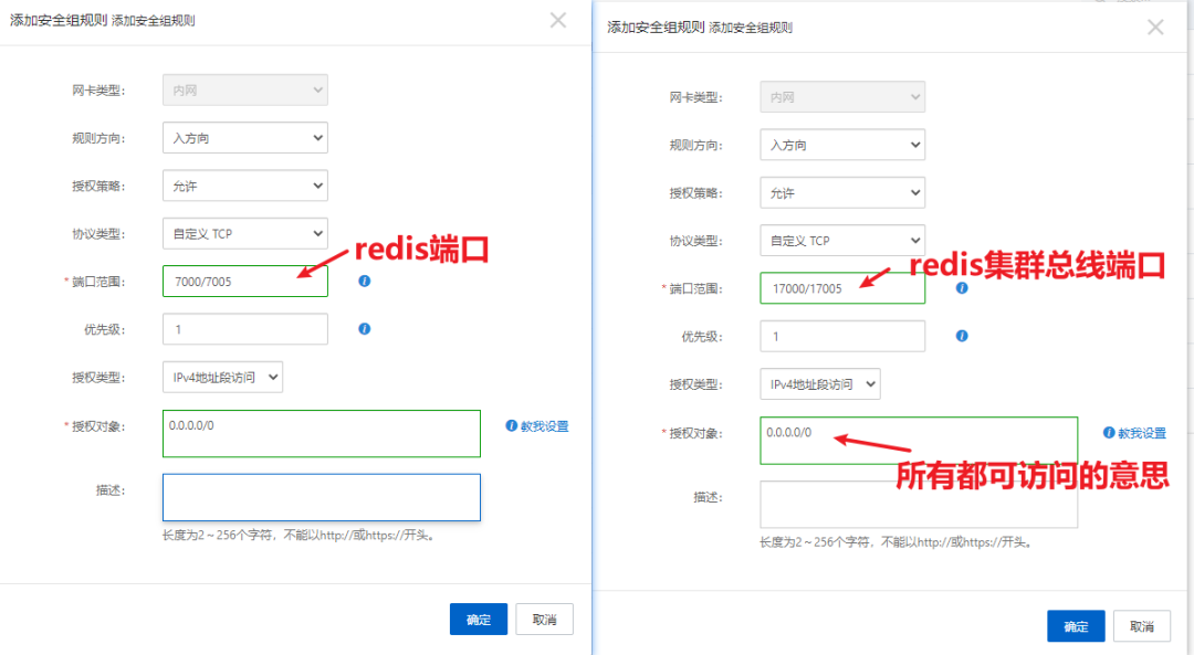 进入安全组配置,添加配置 添加redis集群的端口号:这里我配的端口号是7000,7001,7002,7003,7004,7005,对应阿里云配置7000/7005 redis集群总线端口为redis客户端端口加上10000,对应的阿里云配置17000/17005