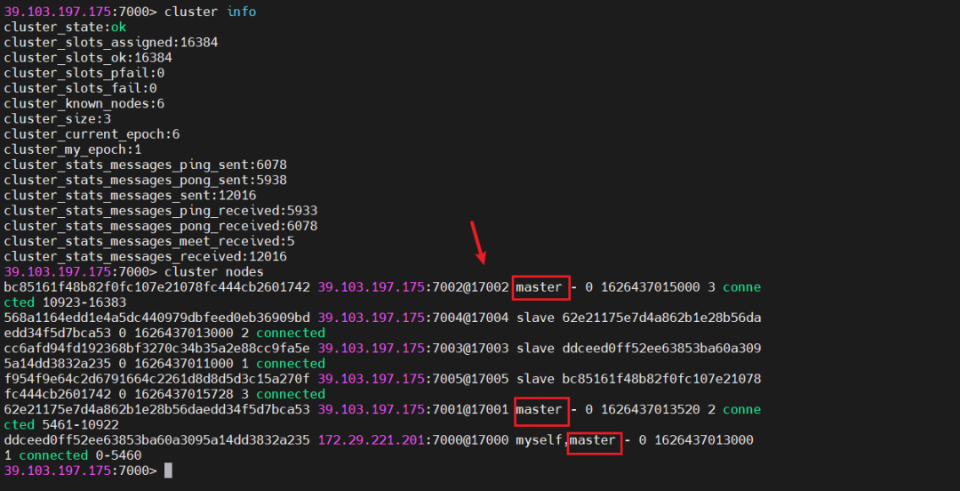 进入客户端:./src/redis-cli -h 39.103.197.175 -p 7000 通过cluster info命令查看集群的情况可以也可以看得出