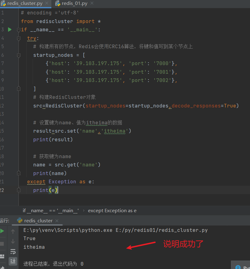 # encoding ='utf-8'from rediscluster import *if __name__ == '__main__':try:# 构建所有的节点,Redis会使⽤CRC16算法,将键和值写到某个节点上startup_nodes = [{'host': '39.103.197.175', 'port': '7000'},{'host': '39.103.197.175', 'port': '7001'},{'host': '39.103.197.175', 'port': '7002'},]# 构建RedisCluster对象src=RedisCluster(startup_nodes=startup_nodes,decode_responses=True)# 设置键为name、值为itheima的数据result=src.set('name','itheima')print(result)# 获取键为namename = src.get('name')print(name)except Exception as e:print(e)